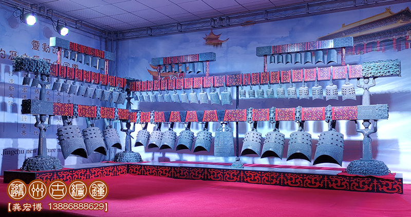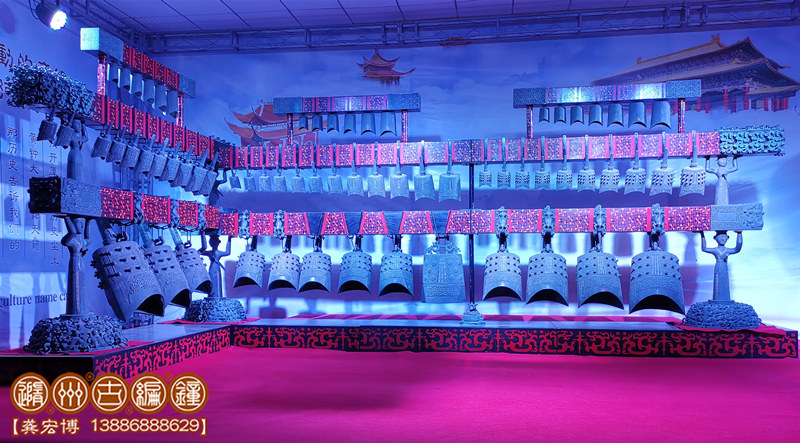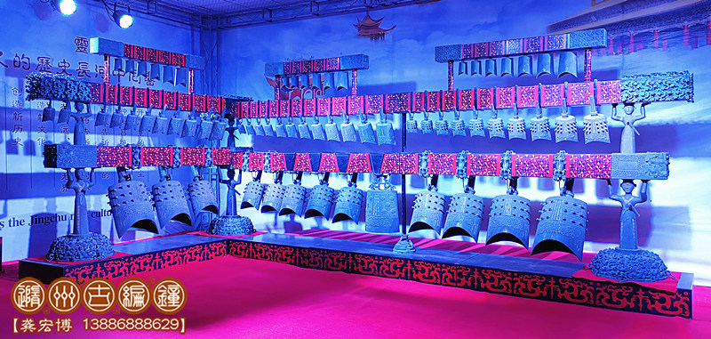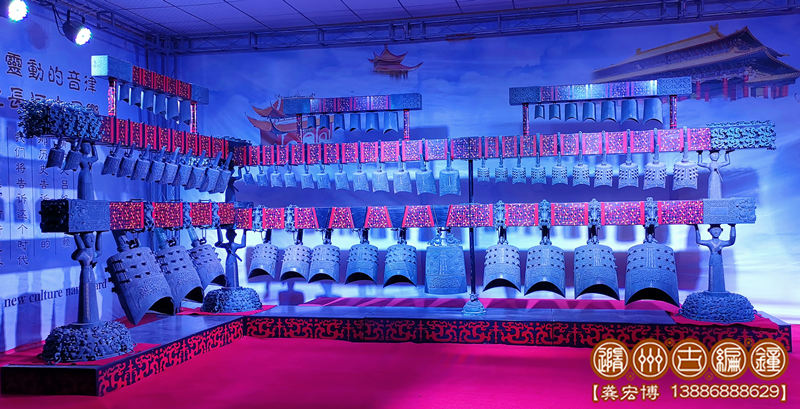 技術(shù)標準:鑄件要求紋飾清晰,表面光潔,無裂、刺、孔、糙等鑄造缺陷;整套編鐘音域5個八度,一鐘雙音,按國際標準A=440Hz調(diào)音,音準控制在±5Hz內(nèi),音色統(tǒng)一協(xié)調(diào),無雜、啞音響。其中下層13件為倍低音甬鐘,在演奏中起到烘托氣氛的作用,中層33件為中音域甬鐘,十二半音齊備,主要用于演奏主旋律,上層19件為被高音鐘和補音鐘,也是重要的半音和補充被高音音域,3組設計可以用于演奏復試旋律。其結(jié)構(gòu)、配件、銘文等全部按照曾侯乙編鐘樣式仿制。
