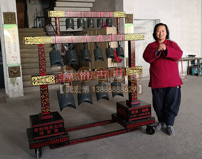 合肥漢韻文化傳習會定制的15件3層編鐘長1.9米、高1.86米、寬0.5米,音律齊全,演奏使用方便,木架上可以彩繪客戶定制文字或圖案,底部安裝鋼制滑輪,安裝移動都非常方便,配有樂器標準航空箱,外出表演得心應手。