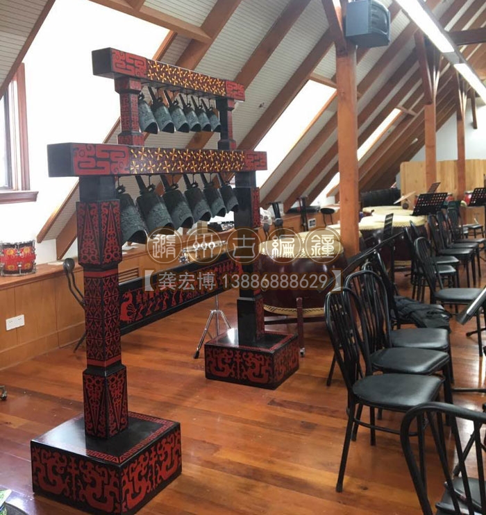 上??蛻舳ㄖ频?2件編鐘長2米、高2米、寬0.55米,分兩層懸掛了12件青銅編鐘,每件編鐘均可發(fā)出2個不同的樂音,半音齊備,采用A=440Hz標準調(diào)音,適合小型民樂團體使用,豐富了民樂團的整體音樂效果,從而獲得客戶的一致好評。