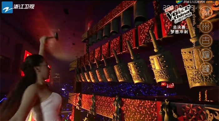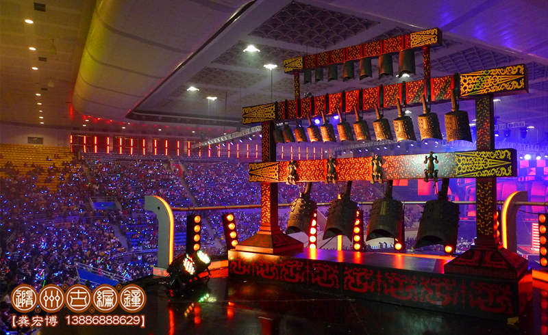 古編鐘公司受節(jié)目組委托將一套中型青銅編鐘運(yùn)達(dá)活動(dòng)現(xiàn)場(chǎng),參加好聲音北京總決賽的開場(chǎng)部分,晚會(huì)以敲擊中國2400多年前的編鐘之聲開場(chǎng),寓意中國文化底蘊(yùn)豐厚,好聲音自古傳今,節(jié)目由此發(fā)掘出中國眾多好聲音學(xué)員,開創(chuàng)新一代造星之路。